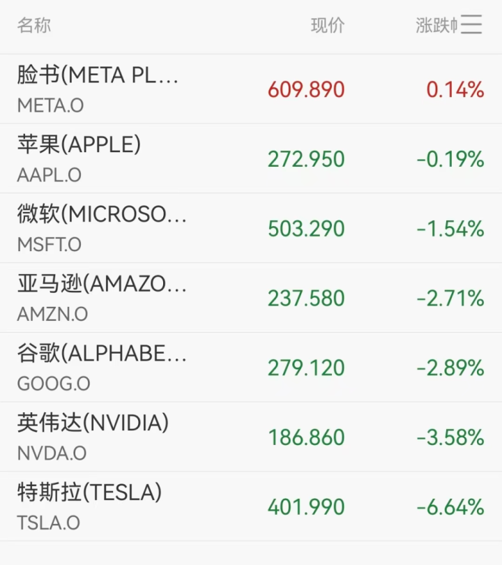 美国大型科技股多数下跌,万得美国科技七巨头指数下跌2.29%。特斯拉跌超6%,博通、甲骨文、AMD均跌超4%。